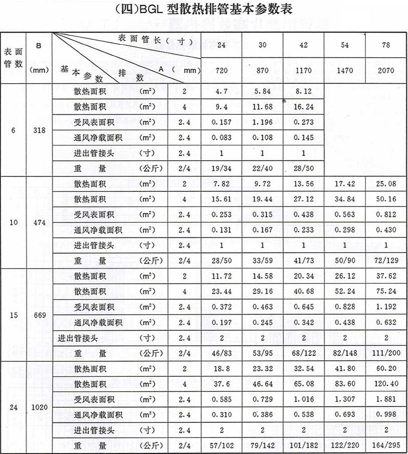BGL型蒸汽散熱器,可分二排、四排、六排,當(dāng)然也能制單排,以及其他非標(biāo)形式,每種型號均有大小不同的規(guī)格,在此只標(biāo)常規(guī)型號、規(guī)格。其中外殼、無縫不銹鋼管¢18×2m/m均用1Cr18Ni9Ti材料,其翅片管用鋁軋制而成,翅片管外徑為¢38mm,根徑為¢19mm,其片高為9.5mm,片距為R片(3m/m),翅片管呈螺旋狀。
